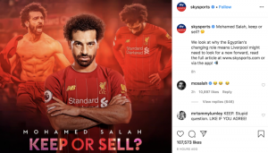 2017 ވަނަ އަހަރު އިޓަލީގެ ރޯމާ އިން 37 މިލިއަން ޕައުންޑުގެ އަގަކަށް ލިވަޕޫލް އަށް ބަދަލުވި ފަހުން އިނގެރޭސި ޕްރިމިއަރ ރަން ބޫޓް 2 ފަހަރު ހޯދާފައިވާ ހުނަރުވެރި ފޯވާޑު “ސްކައި ސްޕޯޓްސް” ގެ އިންސްޓަގްރާމް ޕޯސްޓަށް ވަނީ ތިންފަހަރު “ލޮލް އިމޯޖީ” ފޮނުވާލާފައެވެ. ހޫނު މޫސުމުގެ ޓްރާންސްފަރ ބާޒާރުގައި ސަލާޙް ވިއްކާލުމާއި ބެހޭގޮތުން ދެކެވޭ ވާހަކަތަކާއި މެދު އޭނާ ދެކޭގޮތް މި ޕޯސްޓަށް ދީފައިވާ ރައްދުން ހާމަވާ ކަމުގައި ތަޖުރިބާކާރުން އަންނަނީ ބުނަމުންނެވެ.