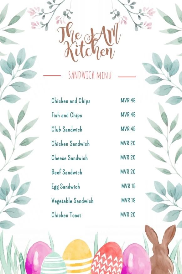 “ދަ ޖޭމް ކިޗަން”ގެ މައި މެނޫގެ އިތުރުން މީރުމީރު ސޭންޑްވިޗް މެނޫއަށް ވެސް ހަމަ ކޮންމެހެން ބަލައިލަން ޖެހެއެވެ. ލިސްޓެއް ލިޔާކަށް ނެތީމެވެ. މެނޫއަށް ބަލައިލަމާ ހިނގާށެވެ.