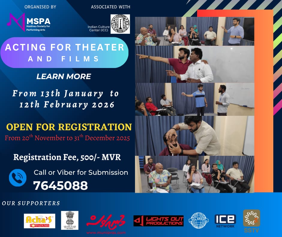 މިއީ މޯލްޑިވްސް ސޮސައިޓީ ފޮރ ޕާފޯމިންގް އާޓްސް (އެމްއެސްޕީއޭ) އާއި އިންޑިއަން ކަޗްލްޗުރަލް ސެންޓަރާއި ގުޅިގެން “އެކްޓިންގ ވޯކްޝޮޕް ފޯ ފިލްމް އެންޑް ތިއޭޓަރ”ގެ ނަމުގައި ބާއްވާ އެކްޓިން ވޯރކްޝޮޕެކެވެ.