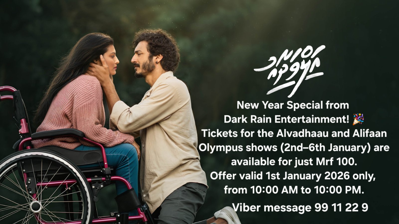 މި ފެށެނު އައު އަހަރު ޖެނުއަރީ 02 ން 06 އަށް އޮލިމްޕަހުގައި ޑާކް ރެއިން އިން ދައްކަން ހަމަޖެހިފައިވާ އެ ޕްރޮޑަކްޝަންގެ ވަރުގަދަ ދެ ފިލްމު ”އަލިފާން“ އަދި ”އަލްވަދާޢު“ގެ ޓިކެޓް ހަމަ އެންމެ 100 ރުފިޔާއަށް ގަންނަން ބޭނުން ހެއްޔެވެ؟ އެހެންކަމަށް ވާނަމަ، 01 ޖެނުއަރީ 2026 ވަނަ ދުވަހު ހެނދުނު 10:00 ން ރޭގަނޑު 10:00 އާއި ދެމެދު ޓިކެޓް ގަންނަން ތައްޔާރުވާށެވެ. އައު އަހަރުގެ ހަދިޔާއެއްގެ ގޮތުން ޑާކް ރެއިން އެންޓަޓެއިންމެންޓުން މިވަނީ ޓިކެޓް އަގުހެޔޮކޮށްލާފައެވެ.