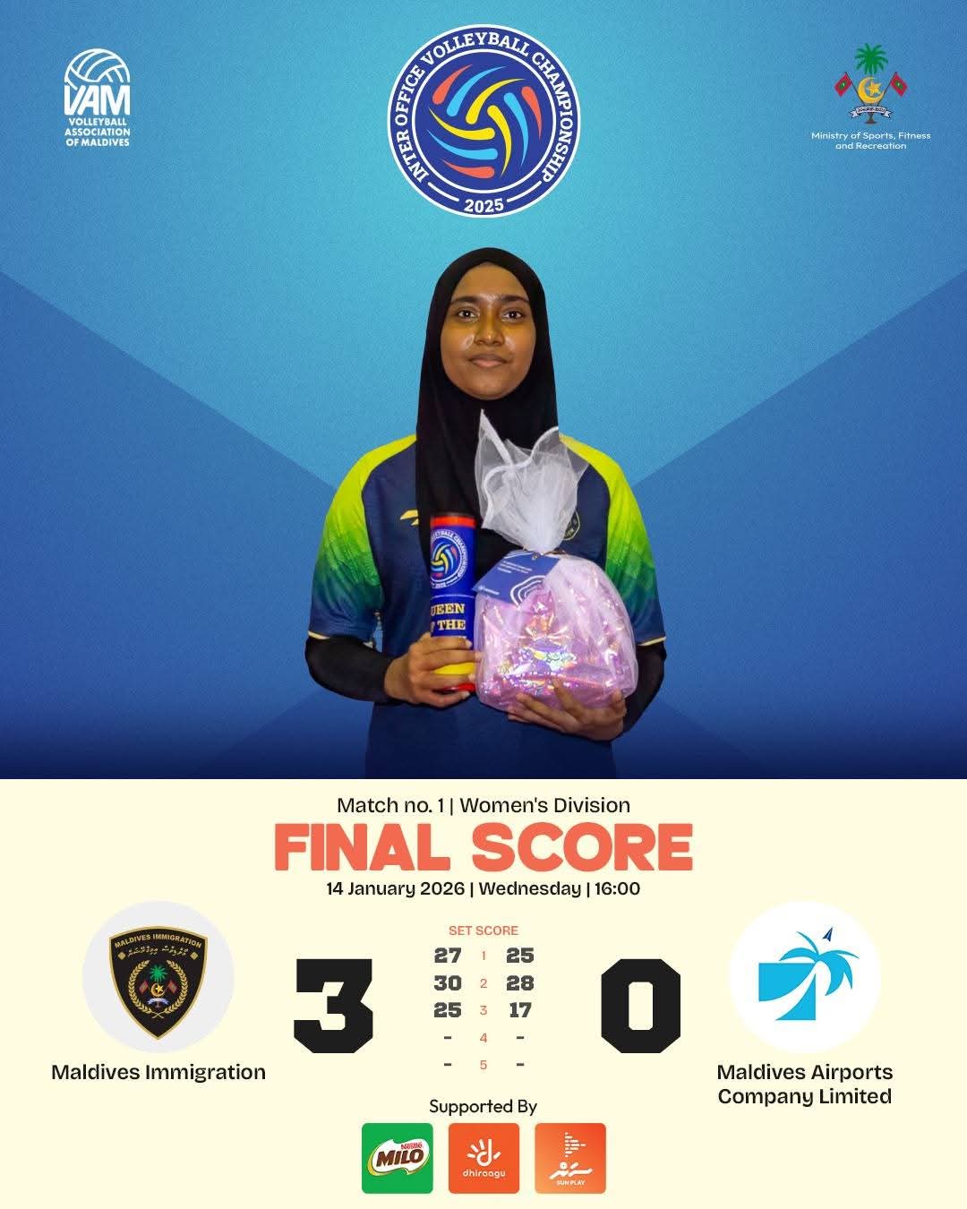 އިންޓަރ އޮފީސް ވޮލީބޯލް ޗެންޕިއަންޝިޕް ވިމެންސް ޑިވިޝަންގެ ފުރަތަމަ ދެ މެޗް މޯލްޑިވްސް އިމިގްރޭޝަނާއި މޯލްޑިވްސް ޕޮލިސް ސާވިސް ކާމިޔާބުކޮށްފިއެވެ.