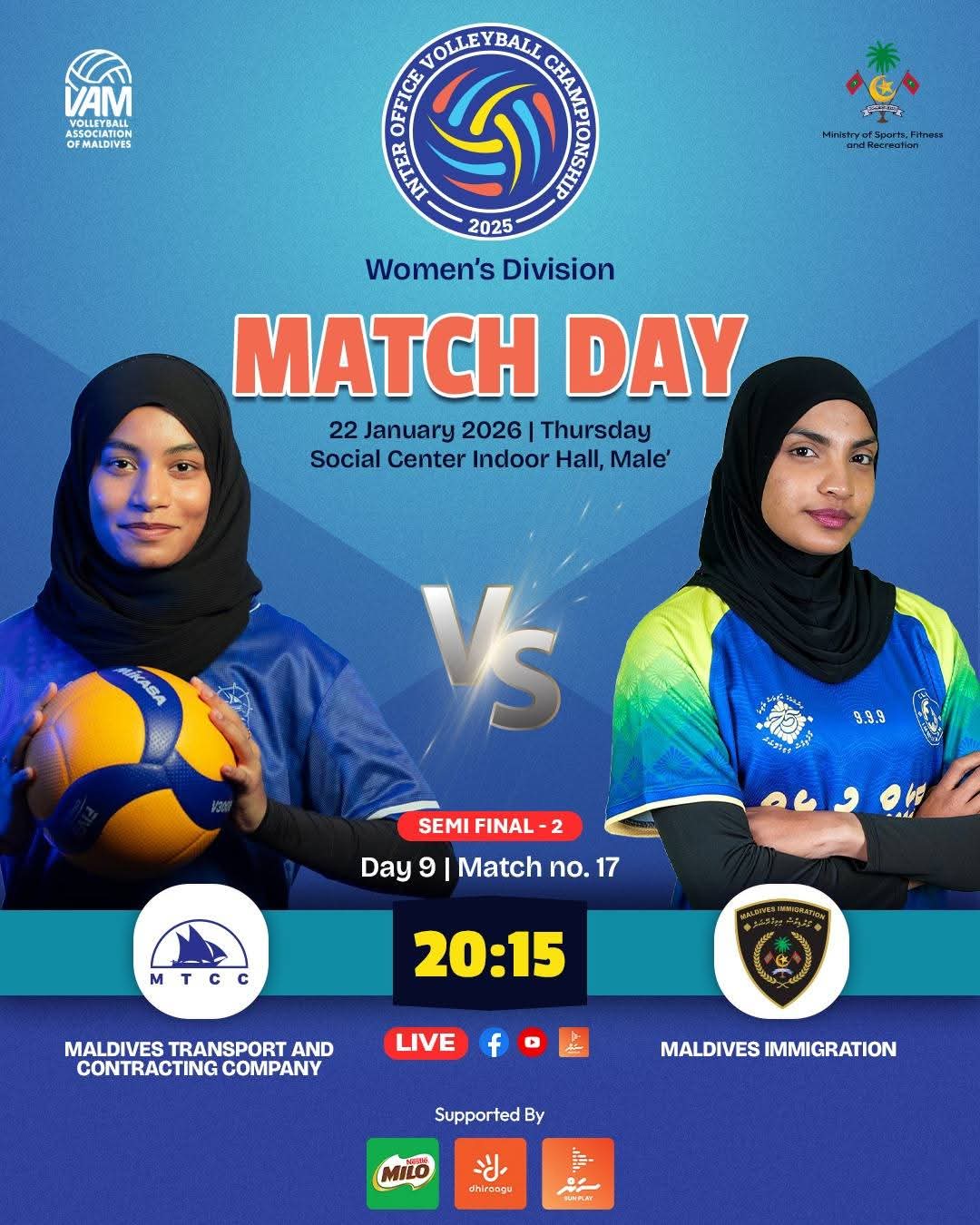 ސެމީ ފައިނަލްގެ 2 ވަނަ މެޗުގައި ބައްދަލުކުރާނީ މޯލްޑިވްސް ޓްރާންސްޕޯރޓް އެންޑް ކޮންޓްރެކްޓިން ކޮމްޕެނީ (އެމް.ޓީ.ސީ.ސީ) އާއި މޯލްޑިވްސް އިމިގްރޭޝަން އެވެ. މި މެޗް ފެށުމަށް ހަމަޖެހިފައިވަނީ މިރޭ 20:15 ގައެވެ.