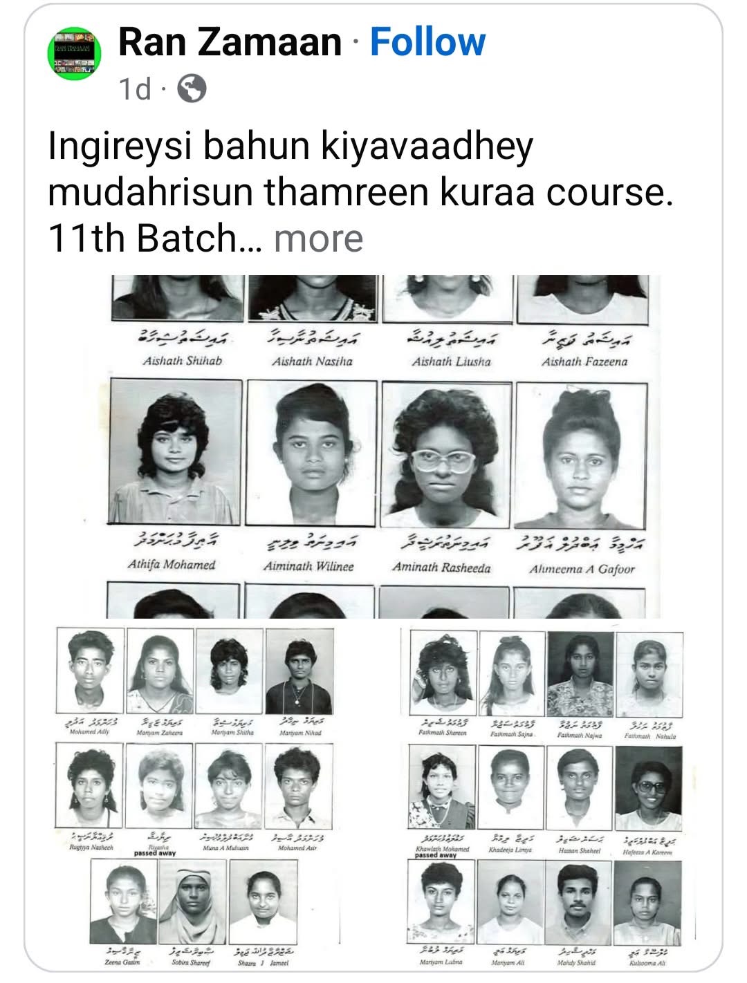 މި ފާއިތުވި ދެތިން ދުވަހު ގިނަ ބަޔަކު އަޅުގަނޑަށް މި ފޮޓޯ ފޮނުވަމުން އެބަގެންދެއެވެ. އެއީ 1990 ވަނަ އަހަރެވެ. އޭރު އަޅުގަނޑުމެން ތަމްރީނުވަމުން ދިޔައީ އިނގިރޭސި މުދައްރިސުން ތަމްރީނުކުރާ ކޯހުގެ 11 ވަނަ ބުރުގައެވެ. އެއީ ނުހަނު ބުރަ ދުވަސްތަކެކެވެ. މިހާރާ އަޅާބަލާއިރު، އޭރުގެ ތަމްރީނުތަކަކީ ވަރަށް ފެންވަރު ރަނގަޅު، ވަރުގަދަ މަސައްކަތްތަކެކެވެ. އެއް އަހަރު ދުވަހުގެ ތެރޭގައި ސެޓްފިކެޓް ހާސިލުކުރުމަށްޓަކައި ކުރަންޖެހުނު މަސައްކަތް ބުރައެވެ. އެ ބުރުން އުފެދުނު މުދައްރިސުންނަކީ ފެންވަރުގެ ގޮތުން ފާހަގަކޮށްލެވޭ ބޭފުޅުންނެވެ. ގައުމަށް އައި ތަރައްގީއާއެކުވެސް، އޭރުގެ މުދައްރިސުންގެ ފެންވަރު މިހާރު ފެންނަ ގިނަ އިނގިރޭސި މުދައްރިސުންނަށްވުރެ ބޮޑުތަނުން ރަނގަޅެވެ. އަޅުގަނޑުމެންގެ އެ ބެޗުގެ ގިނަ ބޭފުޅުންނަކީ މިހާރު ބޮޑެތި ސުކޫލުތަކުގެ އިސް މަގާމުތަކުގައި ތިއްބެވި ބޭފުޅުންނެވެ. މި ފަންނުގައި އެ ބޭފުޅުން ދެމިތިއްބެވި ކެތްތެރިކަމަށްޓަކައި ސާބަސް ދަންނަވަމެވެ. ޒިންމާދާރު މުދައްރިސަކަށް ވުމަކީ ބުރަ މަސައްކަތެކެވެ. އެއީ ސުކޫލުގެ ވަގުތު ނިމިގެން ގެއަށް އައުމަށްފަހުވެސް ނުނިމޭ، ދިގުލައިގެންދާ މަސައްކަތެކެވެ. އަހަރުތަކެއް ވަންދެން ކިޔަވައިދިނުމުގެ ދާއިރާގައި އުޅުމަށްފަހު، އެ ފަންނު ދޫކޮށްލަން އަޅުގަނޑަށް މަޖުބޫރުވި މައިގަނޑު ސަބަބަކީވެސް އެއީއެވެ.